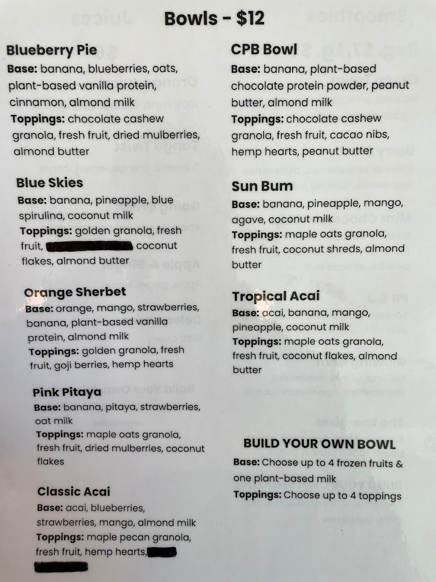 Base: Banana, cherry, mango, house made cashew cream, plant based vanilla protein, cinnamon, agave, almond milk Toppings: Maple pecan granola, strawberries, dried mulberries.