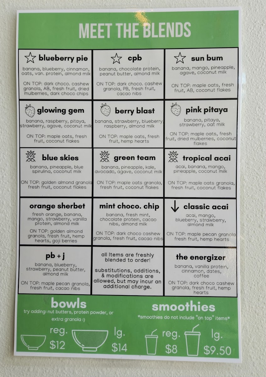 Base: banana, blueberries, raspberries, strawberries, fresh mint, agave, lime juice, San Pellegrino Toppings: Maple oats granola, fresh fruit, hemp hearts
