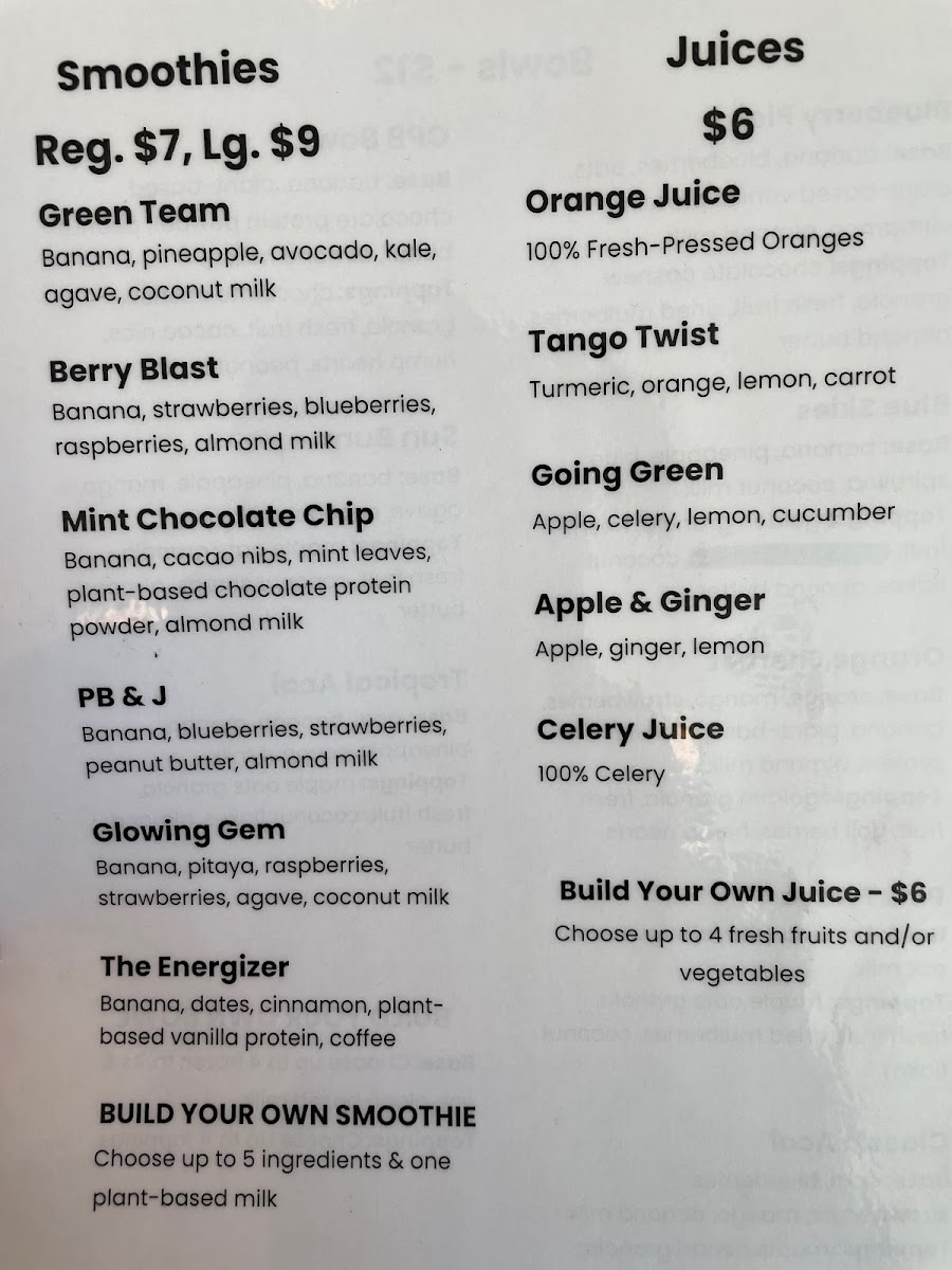 Base: banana, pineapple, mango, agave, coconut milk. Toppings: maple oats granola, fresh fruit, coconut shreds, almond butter.